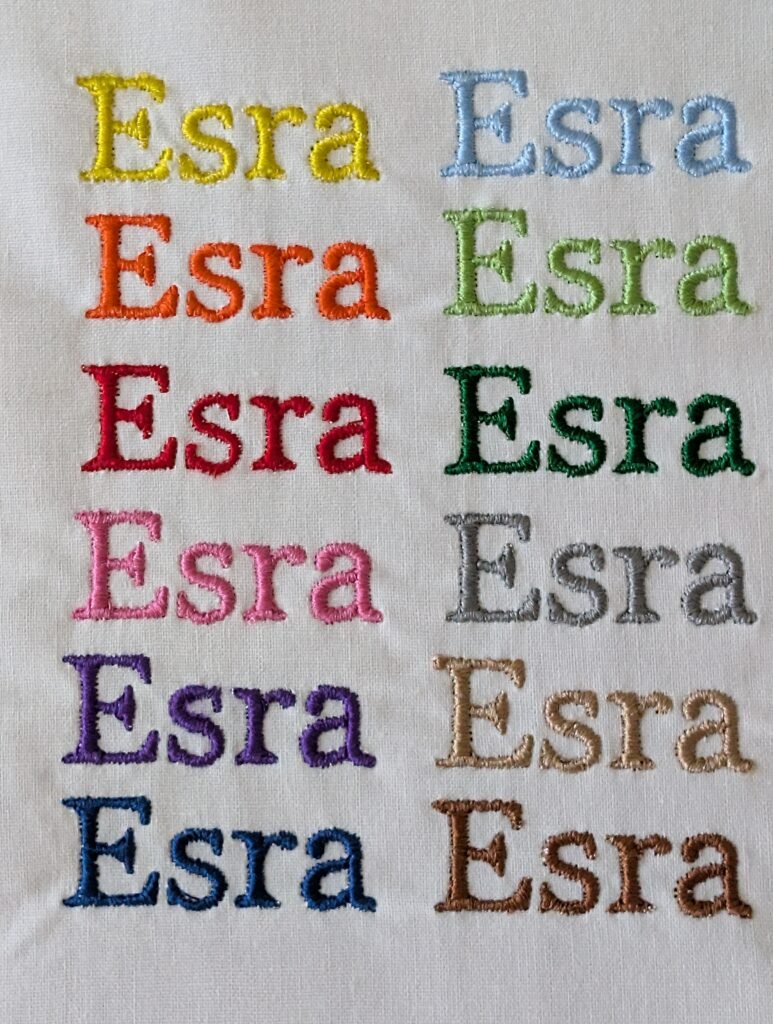 Next, it’s time to decide on the color of the embroidered name. You can choose from bright tones like yellow, red, or pink, as well as elegant shades like grey, light brown, or dark green. This way, your gift perfectly matches the baby towel or bib.