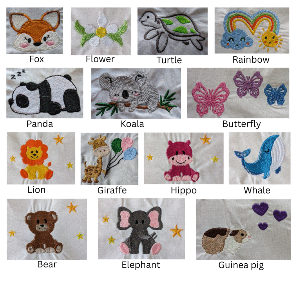 Every baby gift starts with a special design. We offer a wide range of embroidered motives to make your present extra adorable. From cheerful animals like hippos, lions, and pandas to sweet options like flowers, rainbows, and butterflies—there’s something for everyone.
